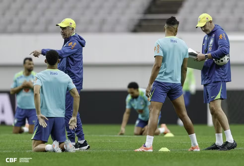 Bruno Guimarães tinha sido poupado da atividade por conta de atraso no voo de Amsterdã para Seul, mas participou normalmente do treinamento no World Cup Stadium. Na atividade, Ancelotti comandou movimentos de transição ofensiva e defensiva após a parte aberta para imprensa e pediu um Brasil com agressividade na marcação alta.